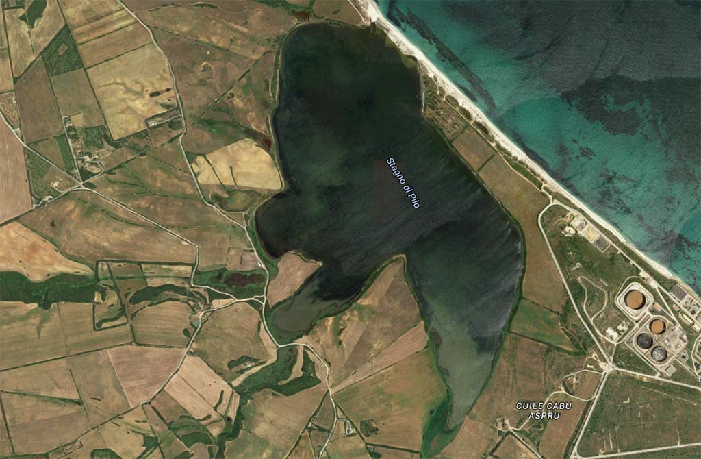 Lo Stagno di Pilo ha invece un'estensione di circa 1.2 Km². E' separato dal mare da una sottile duna sabbiosa. A differenza dello stagno delle saline quello di Pilo è alimentato da piccoli ruscelli che ne addolciscono le acque in maniera irregolare in più punti. La banchina, ricoperta da sale ed un tappeto di frammenti di conchiglie è estremamente soffice ed in certi punti è persino cedevole, non prestandosi così ad essere percorsa a piedi se non con molta attenzione. Lo stagno di Pilo in particolare, grazie al fatto di essere nascosto dallo sguardo dei curiosi, per la sua posizione interna rispetto alla strada principale, ha il fascino che certa fauna sempre dona a questi posti. Sono infatti visibili in alcuni periodi dell'anno i fenicotteri rosa che qui hanno nidificato come anche in altri stagni salati in Sardegna (ad esmpio quello di Cabras). Ma lo stato di abbandono gli ha anche conferito un aspetto sinistro sulla costa dove ogni tanto si possono trovare carcasse di grossi pesci e altri animali.