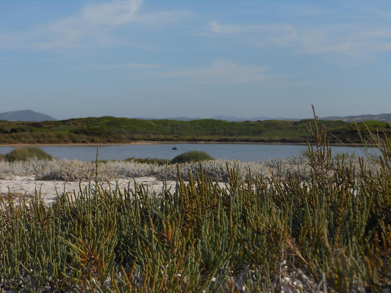 La caratteristica di questi stagni è di essere costituiti di acqua salmastra; in molti punti si possono notare depositi salini evidenti che si formano al ridursi dei livelli dell'acqua nei periodi più aridi. In tutti gli stagni infatti il lato che costeggia il mare è soggetto a costanti infiltrazioni di acqua salmastra. E' ovvio che la vegetazione non può che essere costituita da specie dotate di alta resistenza alla salinità del suolo; si tratta di formazioni a cespuglio e giunchi e, nelle parti più interne, tamerici.